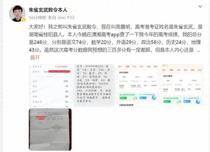 湖南郴州的00后小伙最近又成了熱搜常客——不是因為改名成功,而是他用"朱雀玄武"這個名字考出的246分高考成績,把網友看愣了。語文74分、數學20分的成績單擺在眼前,讓人突然意識到:比起糾結名字霸氣與否,這孩子更該琢磨怎么解數學題。