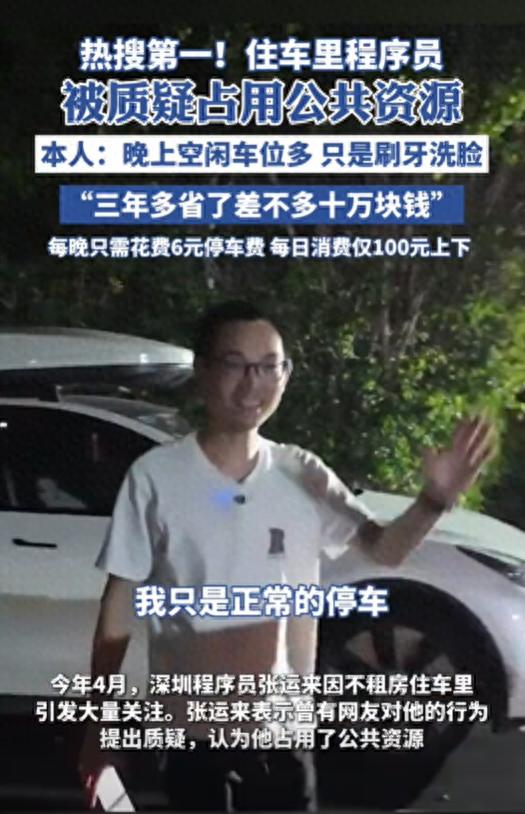 今年4月,深圳程序員張運來因不租房住車里引發大量關注。張運來表示曾有網友對他的行為提出質疑,認為他占用了公共資源。