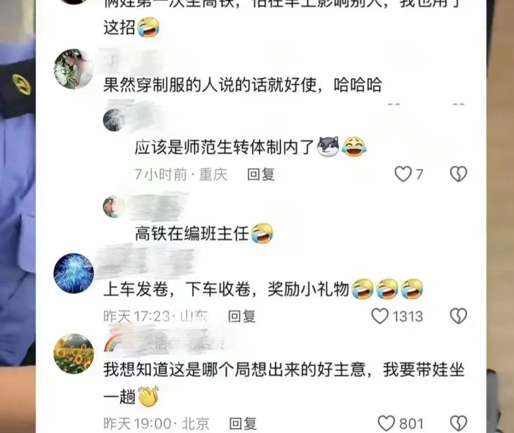 00后列車員拎著塑料袋,給吵鬧小孩發試卷當“獎勵”,安靜孩子發貼紙。車廂秒靜,家長狂贊,全網夸“帶娃神器”。