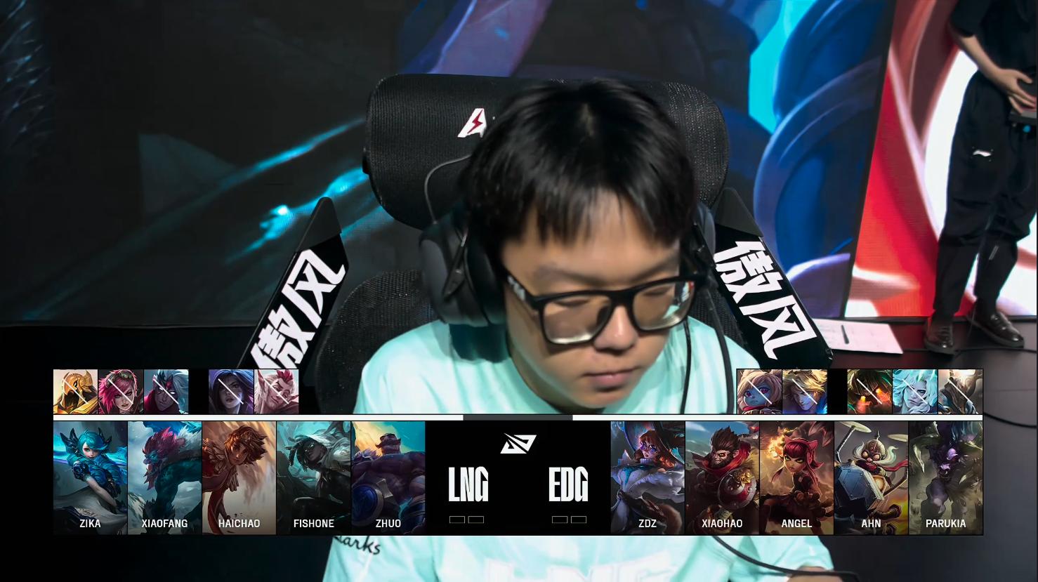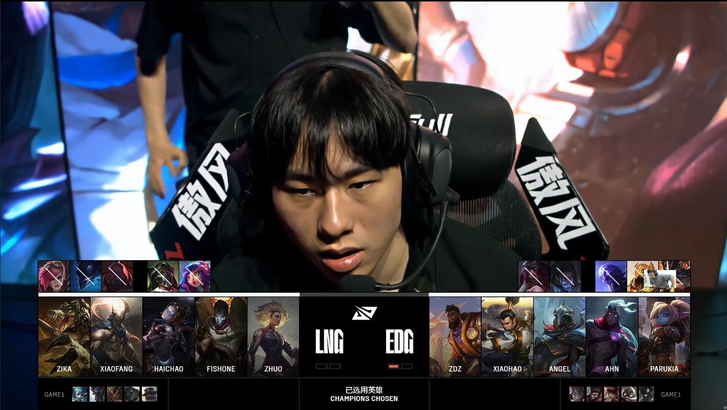 第一局比賽,LNG藍(lán)色方,禁用:沙皇、蔚、韋魯斯、卡莎、洛,選用:Zika格溫、xiaofang巨魔、haichao巖雀、fishone賽娜、Zhuo布隆;EDG紅色方,禁用:潘森、破敗王、泰坦、EZ、波比,選用:Zdz阿蘿拉、Xiaohao猴子、Angel安妮、Ahn飛機(jī)、Parukia阿利斯塔