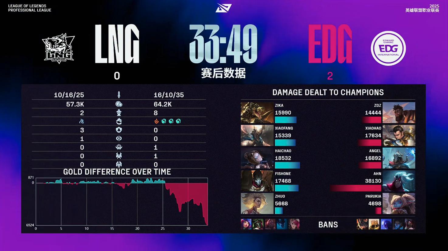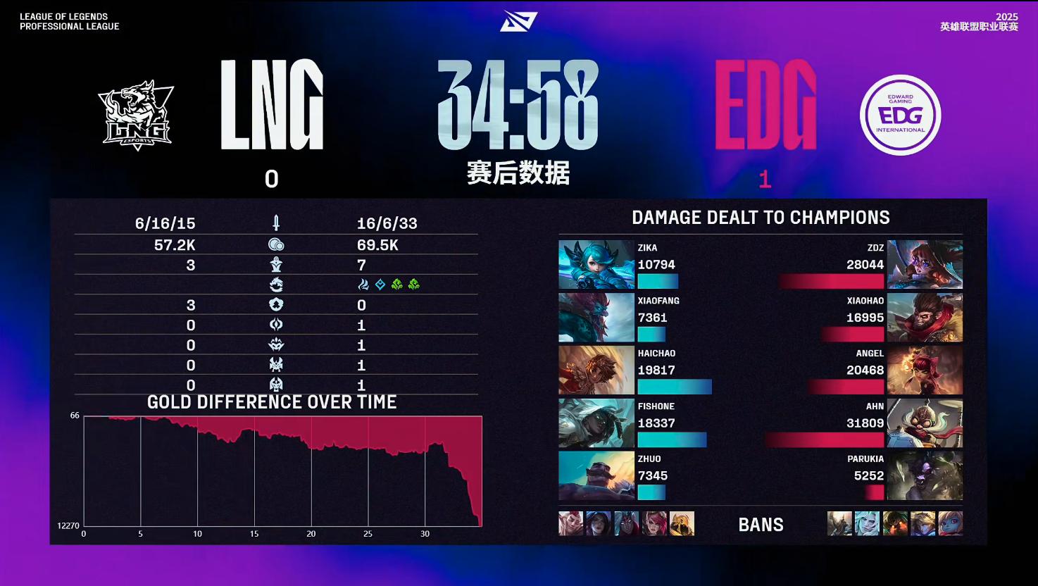 結(jié)果比賽,被EDG打成了單方面的碾壓局。比賽第7分鐘左右,中路爆發(fā)小規(guī)模團(tuán)戰(zhàn),EDG拿下一血;比賽第11分鐘左右,野區(qū)爆發(fā)團(tuán)戰(zhàn),EDG打出1換2;比賽第26分鐘左右,爆發(fā)小龍團(tuán),EDG打出1換2;比賽第31分鐘左右,野區(qū)爆發(fā)團(tuán)戰(zhàn),EDG打出1換3;最終34分58秒,EDG團(tuán)滅LNG,先贏一局!