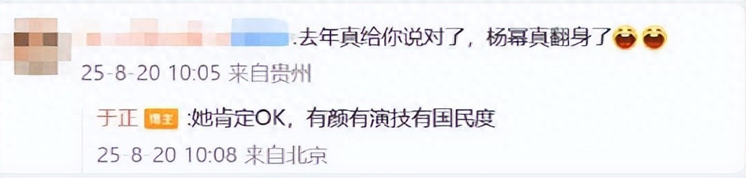 8月20日,導演于正發(fā)博“再多熱度也比不上作品的力量”引發(fā)網(wǎng)友熱議,評論區(qū)有網(wǎng)友說:去年真給你說對了,楊冪真翻身了。
