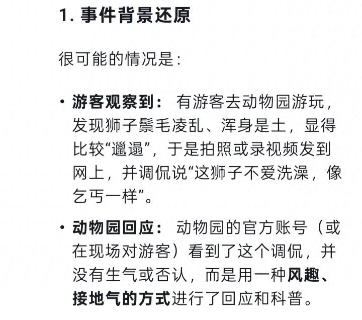 對游客而言: 明白了獅子“邋遢”的外觀是其正常的天性,并非動物園照顧不周。對動物園而言: 用低成本的方式展示了其科學飼養的理念,贏得了公眾的好感和流量。對獅子而言: 它只是按照自己千萬年進化來的方式生活著,完全不知道自己在網上已經成了“網紅乞丐”,它可能覺得自己披著泥土和塵埃的“戰袍”帥極了。