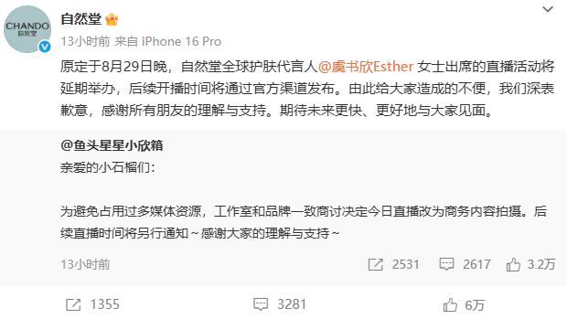 此外,自然堂官方賬號發文:“原定于8月29日晚,自然堂全球護膚代言人虞書欣女士出席的直播活動將延期舉辦,后續開播時間將通過官方渠道發布。由此給大家造成的不便,我們深表歉意,感謝所有朋友的理解與支持。期待未來更快、更好地與大家見面。”