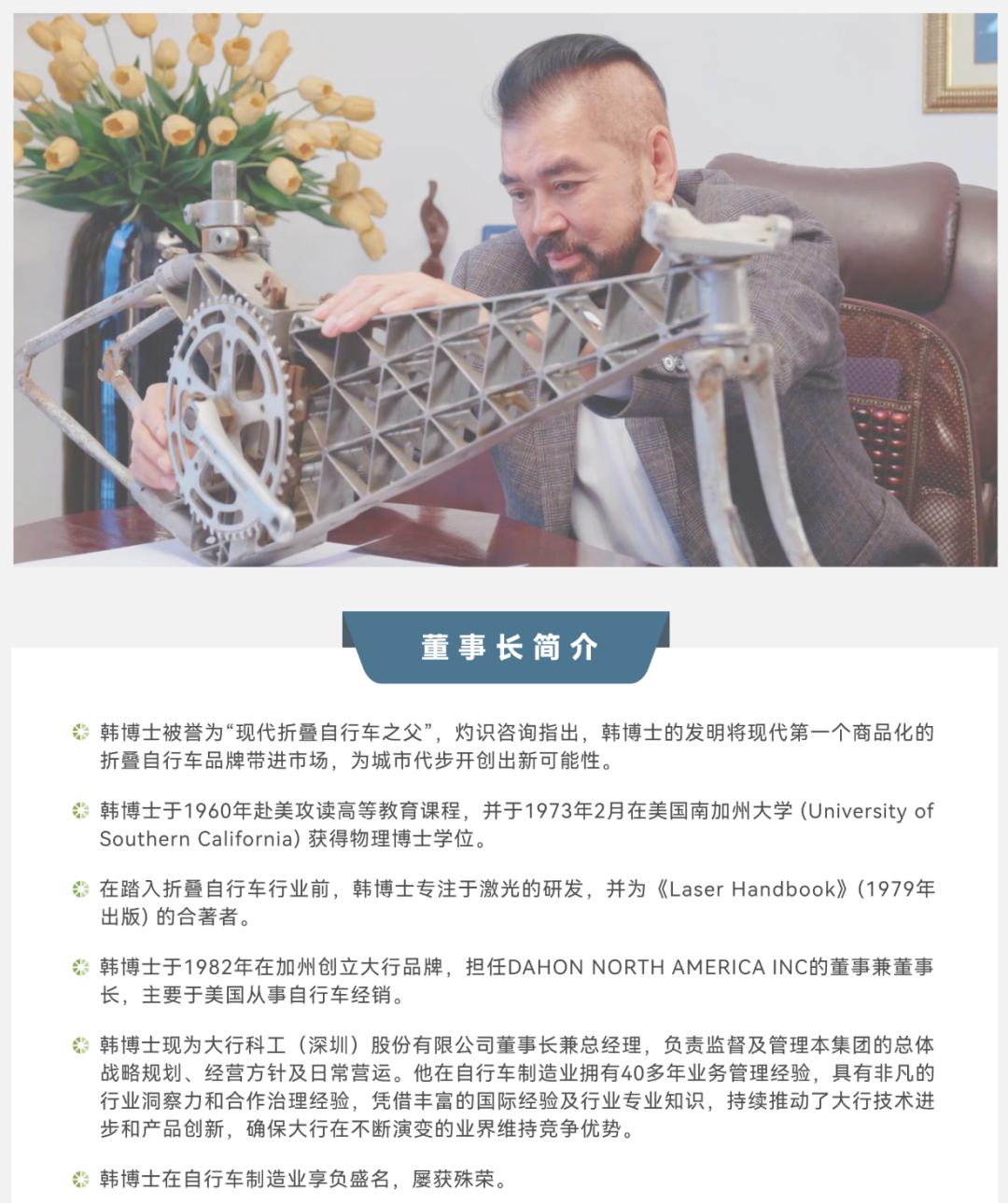大行科工主營折疊自行車,公司董事長韓德瑋曾在美國南加州大學獲物理博士學位,并專注于激光領域研究。1982年,韓德瑋創業建立“大行”品牌,現年83歲的他仍奮斗在大行科工經營管理一線,行業稱其為“現代折疊自行車之父”。