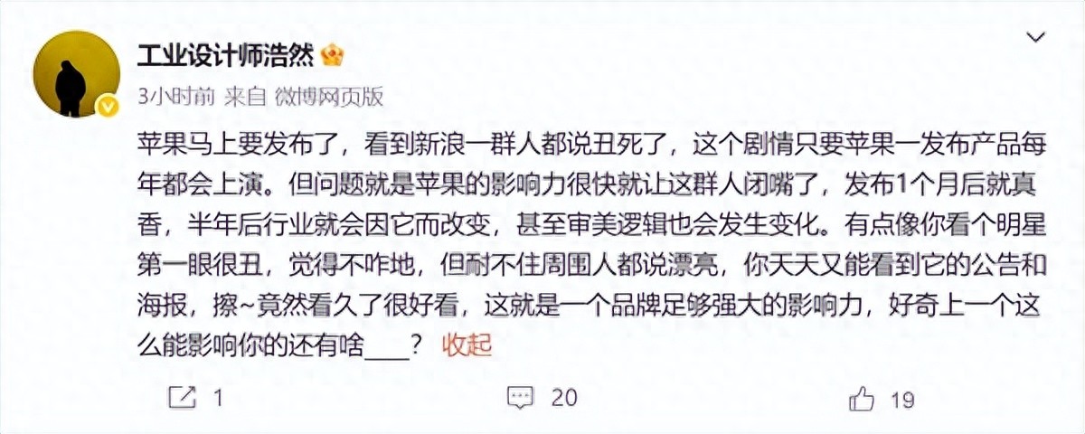 9月8日消息,一加工業(yè)設計師劉浩然發(fā)文表示,蘋果馬上要發(fā)布了,看到新浪一群人都說丑死了,這個劇情只要蘋果一發(fā)布產品每年都會上演。