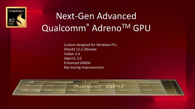 GPU 方面,驍龍 X2 Elite 計算平臺搭載全新一代 Adreno GPU,支持 DirectX 12.2 Utimate 和
