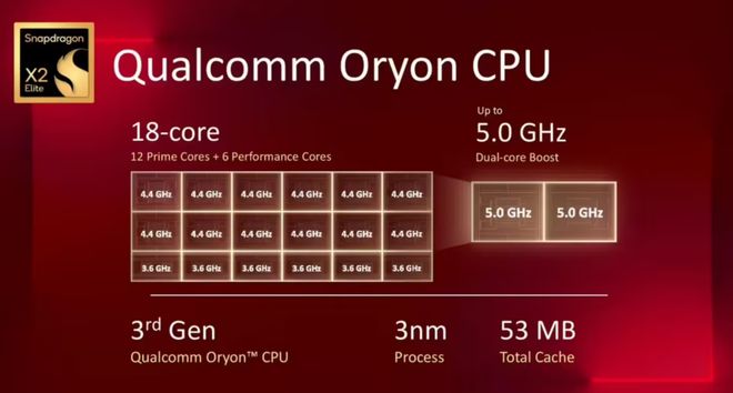 全新驍龍 X2 Elite 計算平臺搭載第三代自研 Oryon CPU,采用最新的 3nm 制程工藝,最高規格的驍龍 X2 Elite Extreme 計算平臺擁有 18 核心,包括 12 個主頻 4.4GHz 的超大核心和 6 個主頻 3.6GHz 的性能核心,CPU 總緩存達到 53MB。