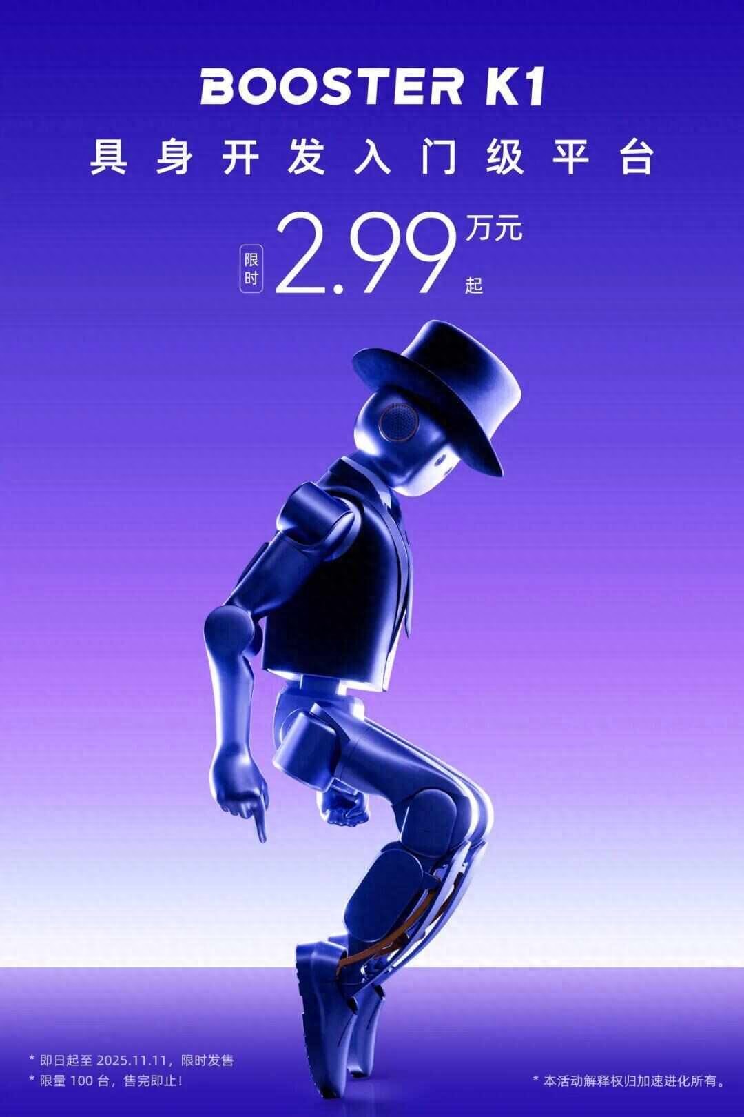 10月21日,加速進(jìn)化發(fā)布BoosterK1具身開發(fā)入門級(jí)平臺(tái)。該機(jī)器人身高1米,體重19公斤,在演示中不僅能跳邁克爾·杰克遜經(jīng)典舞蹈,還能駕馭太空步。