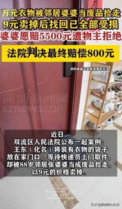居民王東(化名)把價值一萬多元的品牌衣物放在家門口待寄,沒想到被88歲的鄰居張婆婆誤當廢品撿走,以9元價格賣給了回收站。