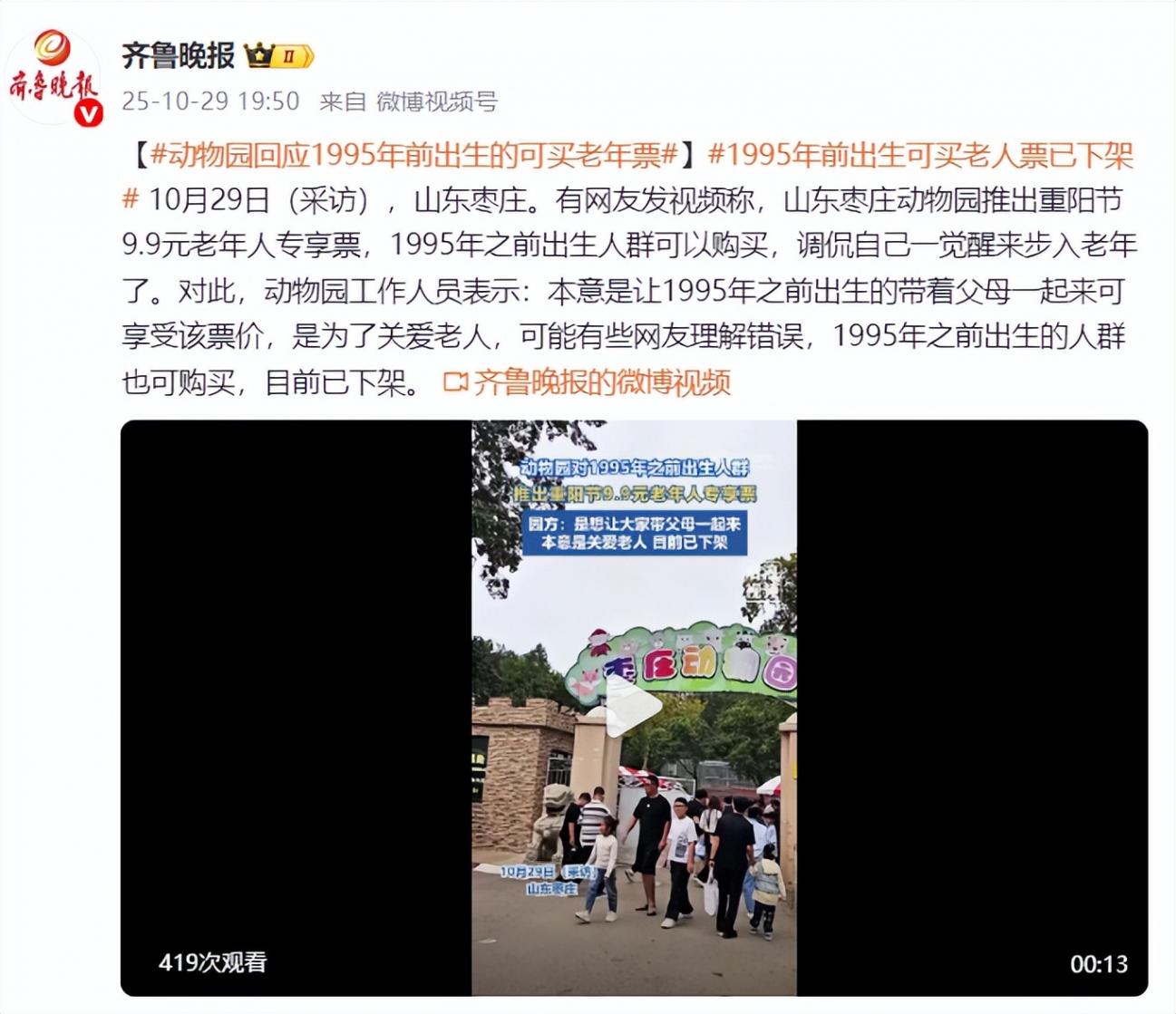 對(duì)此,動(dòng)物園工作人員表示:本意是讓1995年之前出生的帶著父母一起來(lái)可享受該票價(jià),是為了關(guān)愛(ài)老人,可能有些網(wǎng)友理解錯(cuò)誤,1995年之前出生的人群也可購(gòu)買(mǎi),目前已下架。
