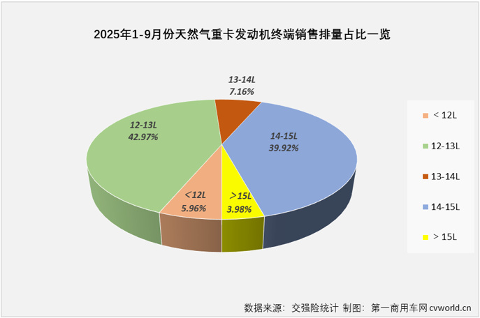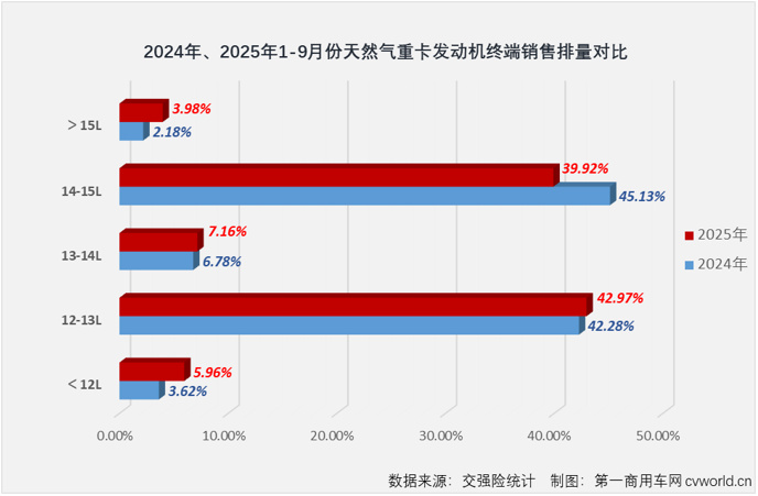 按排量看,2025年1-9月,燃?xì)庵乜òl(fā)動(dòng)機(jī)主力排量區(qū)間是12-13L及14-15L區(qū)間,占比分別達(dá)到42.97%和39.92%,>15L的大排量燃?xì)獍l(fā)動(dòng)機(jī)占比為3.98%(其中9月份占比達(dá)到4.93%)。與去年同期相比,燃?xì)庵乜òl(fā)動(dòng)機(jī)市場(chǎng)14-15L機(jī)型占比有所下降,其他排量機(jī)型占比均有不同程度提升(如下圖)。