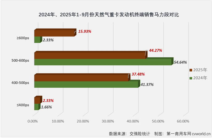 按馬力段看,2025年1-9月,燃?xì)庵乜òl(fā)動(dòng)機(jī)主力馬力區(qū)間是500-600馬力及400-500馬力,分別占到44.27%和37.48%的比重;超大馬力(≥600馬力)機(jī)型占比達(dá)到15.93%(最近的5-9月份單月占比均超過(guò)17%,分別達(dá)到17.34%、17.59%、17.71%、18.06%和18.24%)。與去年同期相比,超大馬力機(jī)型占比提升了超13個(gè)百分點(diǎn),400-500馬力段及500-600馬力段機(jī)型占比均有所下降(如下圖)。