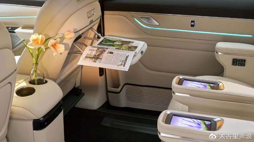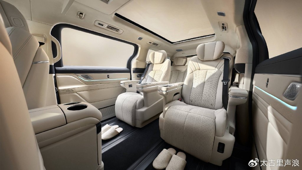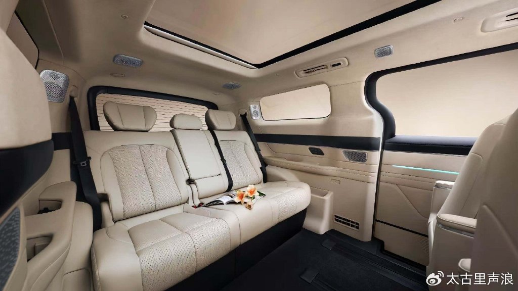車內,第一排座椅后方配置有小桌板;第二排為獨立座椅,坐墊寬大厚實,并有可以調節的腿托,大概率為零重力座椅。并且中間扶手配有液晶屏,通常可以控制座椅、空調等。值得一提的是,全景天窗向后延伸到了第三排上方,提高了第三排乘客的視覺空間,減少壓抑感。