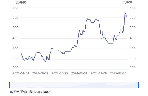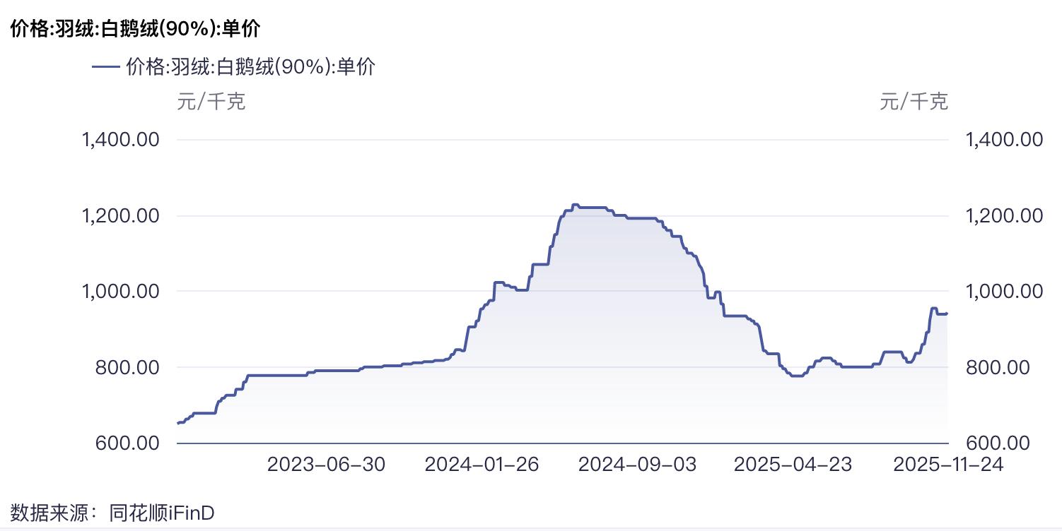 同花順iFinD數(shù)據(jù)顯示,90%白鴨絨價格達到近年高點。90%白鵝絨近年價格高點出現(xiàn)在2024年年中,近期盡管價格同比上漲,但未及當(dāng)時高點水平。