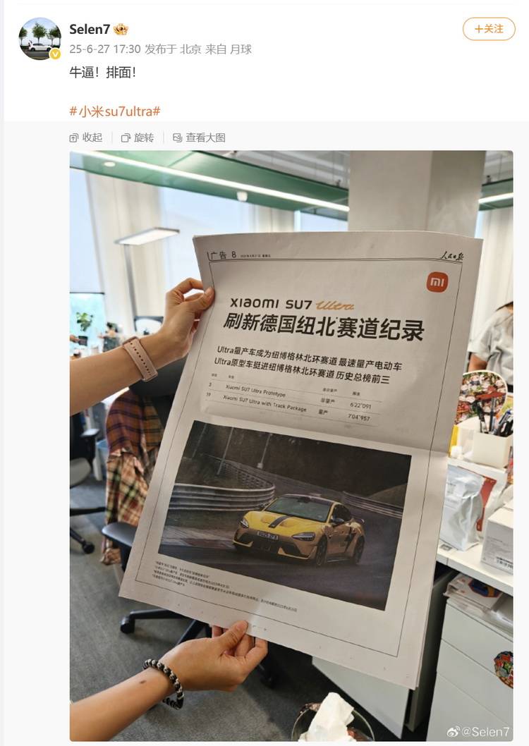 雖然《人民日?qǐng)?bào)》不乏對(duì)小米的報(bào)道,但是年內(nèi)小米登上《人民日?qǐng)?bào)》并引起網(wǎng)友關(guān)注多是以廣告形式。在6月27日,小米中國(guó)區(qū) 智能硬件市場(chǎng)負(fù)責(zé)人 @Selen 發(fā)微博“牛逼!排面!”,并附上《人民日?qǐng)?bào)》刊登小米SU7 Ultra刷新紐北紀(jì)錄的照片,但是眼尖的網(wǎng)友很快發(fā)現(xiàn)這是小米投放廣告。到了9月29日小米公司新媒體總監(jiān) @神得強(qiáng)Steven 發(fā)微博“同事給了我一份人民日?qǐng)?bào),一整版都是小米17 Pro,隨手拍一張留個(gè)紀(jì)念”,并附上自己與人民日?qǐng)?bào)的合照,結(jié)果這又是小米花錢(qián)刊登的廣告,于是網(wǎng)友紛紛稱(chēng)贊有“排面”。