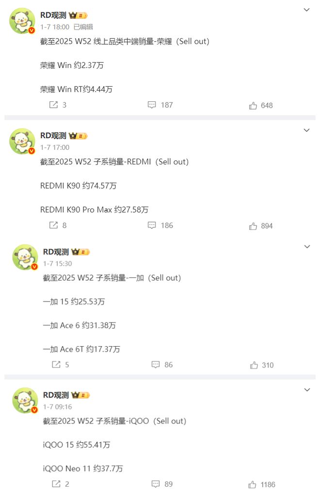結合行業人士“RD觀測”此前提供的截止2025年W52周的數據,我們就可以算出在2026年W1周這些性能游戲體驗機的銷量是多少。其中REDMI K90的銷量為7.1萬臺,REDMI K90 Pro Max的銷量為1.41萬臺,二者合計8.51萬臺;iQOO 15的銷量為3.31萬臺,iQOO Neo11的銷量為3,68萬臺,二者合計6.99萬臺;一加15的銷量為1.92萬臺,一加Ace 6的銷量為3.03萬臺,一加Ace 6T的銷量為4.00萬臺,三者合計8.95萬臺;榮耀WIN的銷量為2.67萬臺,榮耀WIN GT的銷量為5.1萬臺,二者合計7.77萬臺。通過周銷量對比大家可以看到在W1這一周之內同檔之中一加的機型銷量最高,但一加是三款機型,友商都是兩款。一加之外REDMI K90系列還是銷量最高的,但榮耀WIN系列已經排名第二了,這一周超越了iQOO的兩款機型。所以講榮耀以性能游戲體驗為主打的機型可以講一鳴驚人,上來就進入同檔第一梯隊。