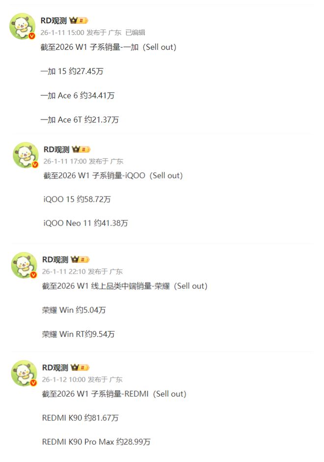 現在這些性能游戲體驗為主打的機型都已經正式商用了,我們來看看它們的市場表現如何。在這里要提醒大家一點,由于發布的時間不同,開售的時長肯定不同,所以不要去對比累計銷量。根據行業人士“RD觀測”提供的數據,截止2026年W1周REDMi K90的銷量達到81.67萬臺,REDMI K90 Pro Max的銷量達到28.99萬臺,二者合計為110.66萬臺;榮耀WIN的銷量為5.04萬臺,榮耀WIN RT的銷量為9.54萬臺,二者合計為14.58萬臺;iQOO 15的銷量為58.72萬臺,iQOO Neo11的銷量為41.38萬臺,二者合計為100.10萬臺;一加15的銷量為27.75萬臺,一加Ace6的銷量為34.41萬臺,一加Ace 6T的銷量為21.37萬臺,三者合計達到83.53萬臺。