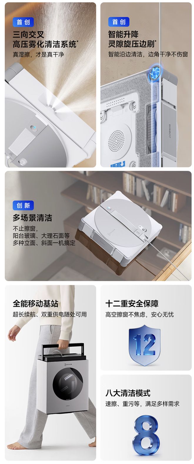 據介紹,該產品首次將地面清潔機器人的基站清洗邏輯引入立面場景,采用了雙向三噴頭設計,同時配備了 Vortex Wash 超旋勁洗系統,能夠模擬人手搓洗邏輯,有效剝離附著在抹布上的鳥糞、雨痕及灰塵等頑固污漬。